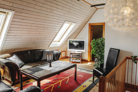 On the first floor is a beautiful living room with sofas and Smart-TV.