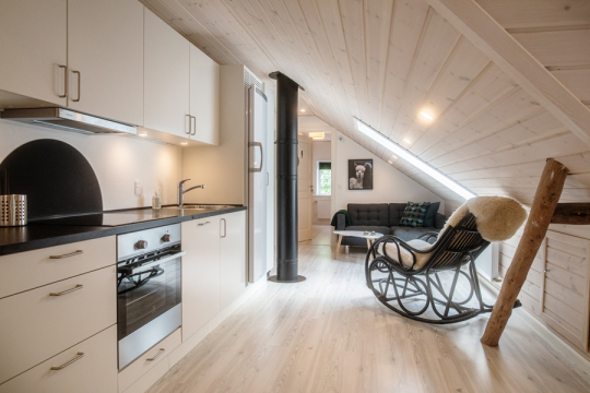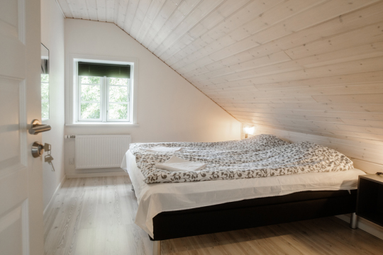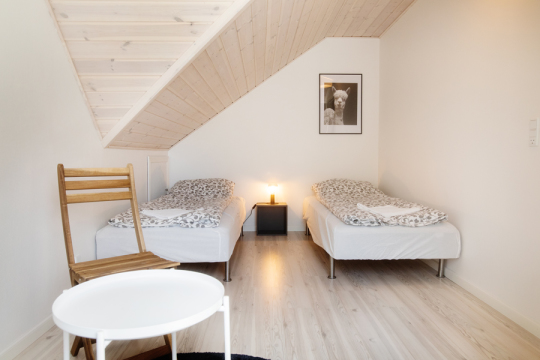 "Kornloftet" means "The Granary" and is located on the first floor with its own entrance. The apartment consists of three double rooms, as well as one bathroom and toilet. The apartment has a well-equipped kitchen, including a refrigerator, stove, coffee machine, microwave, and dining table. Additionally, there is a cozy corner with a small sofa.