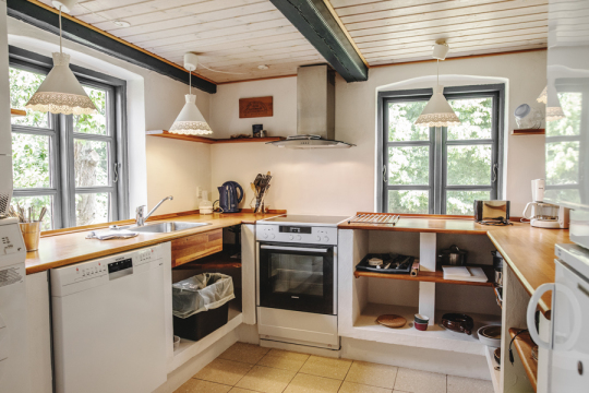 Large communal kitchen and dining area with ten seats around a beautiful wooden table. In addition, there is a small refrigerator and freezer for each room.